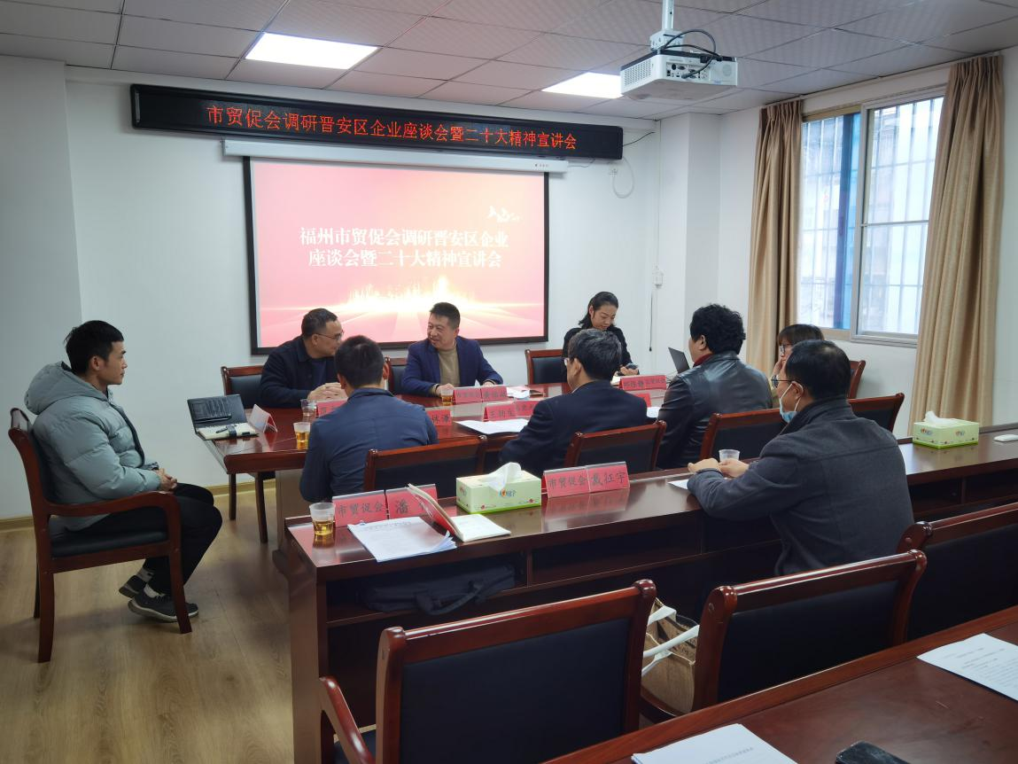为深入学习贯彻党的二十大精神,切实发挥贸促会联结经贸界人士、企业、团体重要纽带作用,围绕贯彻全省“深学争优、敢为争先、实干争效”行动及福州市国际商会重点工作,我会于2月9日上午前往晋安区贸促会开展党的二十大精神宣讲及基层企业调研座谈会。
