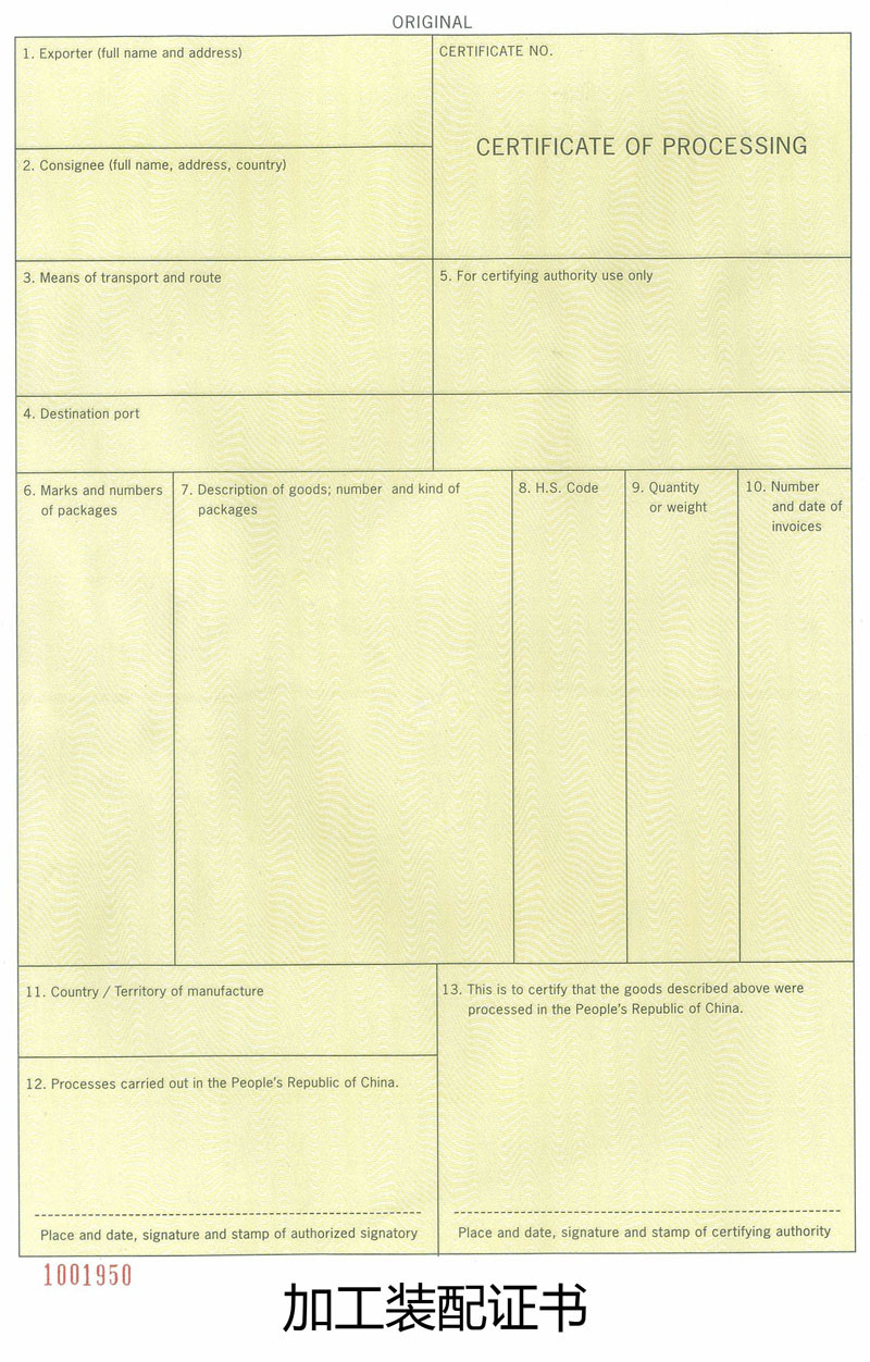 加工装配证书