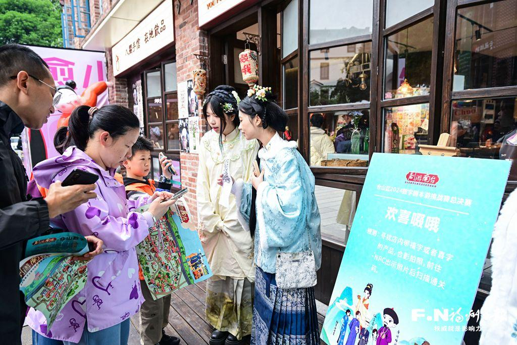 螺洲古镇“剧游南台”数字剧本游挑战赛选手在打卡点扫码打卡 例如,螺洲古镇数字化与新消费场景项目,综合运用AR、VR、3D互动及AIGC等技术,将“帝师之乡”的文化资源打造为吴石将军事迹光影秀、沉浸式MR剧场等可体验、可消费的数字产品。 “神游福州”数字赋能沉浸式消费新场景项目,通过搭建“一码通玩”智慧平台、引入机器人NPC等元素,实现商圈、景区、民宿等多业态的数据贯通与消费联动。 冠亚广场AI文化新业态消费融合示范项目,通过开发“AI游鼓楼”小程序和部署AR沙盘展厅,技术联动周边乌山、于山等文旅节点,构建辐射核心区的消费新生态。